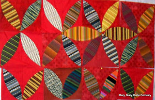 I collected as many striped fabrics as I could find at a recent quilt show in Springfield, MO. The blocks are on the wall in no particular order. I just threw them up there as I finished them. If memory serves, the pattern calls for 24 blocks, each with two of the "petals". After the blocks are sewn together, the horizontal pieces (just pinned on at present) are appliqued over the horizontal seams. The books is wonderful and as the title implies, features projects made with striped fabrics. I love nearly every single one in the book and frankly don't think there is a dud among them.